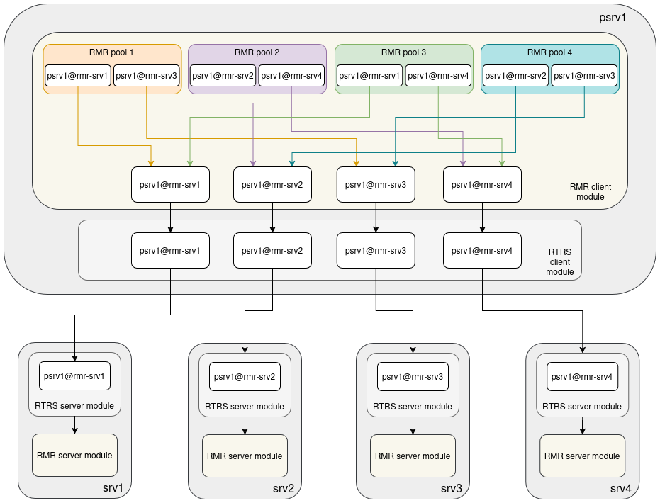 By separating pool_sess from clt_sess, pools that replicate to the same storage node share a single RTRS session. In the diagram, pools 1 and 3 both have a leg to rmr-srv1; they share the psrv1@rmr-srv1 clt_sess and the single RTRS session beneath it. The number of RTRS sessions is bounded by the number of unique storage nodes, not the number of pools.