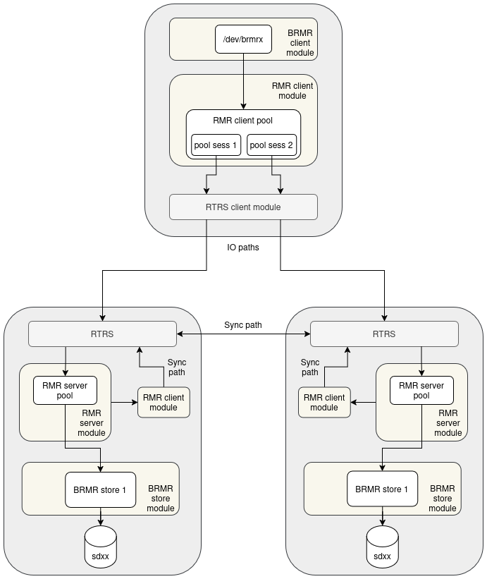Each storage node also runs an RMR client module and an RTRS client module that connect to the other storage node. This is the sync path: when a storage node needs to recover dirty chunks, it reads the missing data directly from its peer over this connection, without involving the compute client. The sync path reuses the same RMR client and RTRS infrastructure as the IO path.