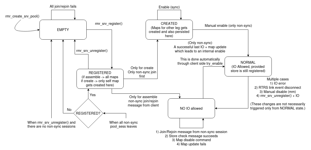 To ensure this information is not lost in case of a single failure (compute client crash), it must also be maintained on the storage nodes. This allows the system to enforce sanity checks and permit only valid state transitions. Additionally, the pool on the storage server side has other processes — such as backend store registration and map creation — that require additional state management.
